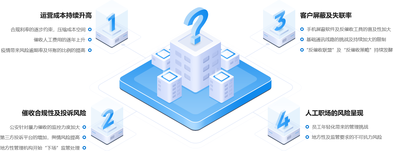 - 整合多模块能力,形成完整的贷后管理的代运营服务方案,向银行提供从资产拆分、AI催收、委外催收到诉讼管理贷后全流程服务