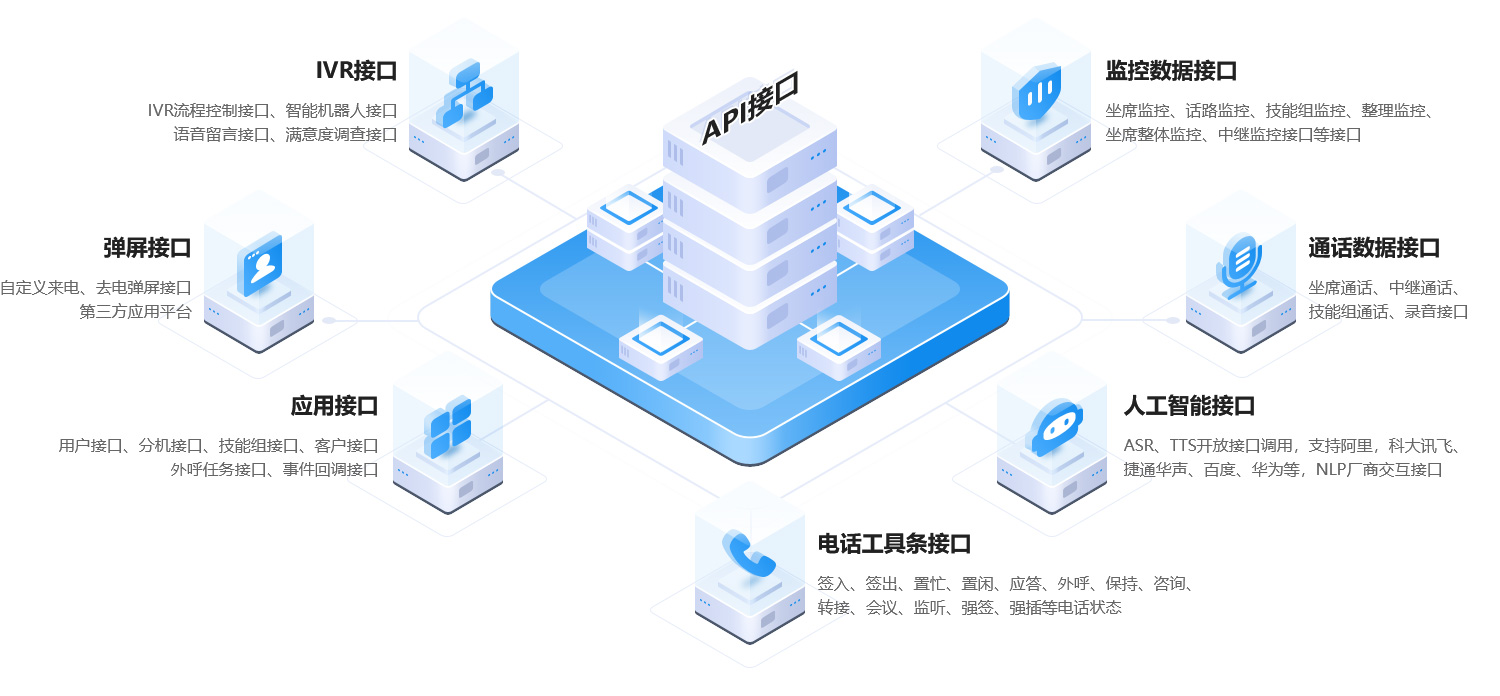 标准接口包括来去电弹屏,坐席监控、通话记录和录音,灵活便捷集成第三方系统,呼叫数据与业务数据灵活可配